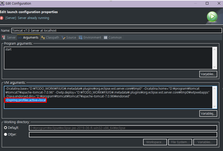 VM arguments에 spring.profiles의 이름을 지정할 수 있다. 나는 로컬 환경에서 테스트 중이었으니 local을 입력해주었다. 그러자 아주 잘~ 실행되었다.