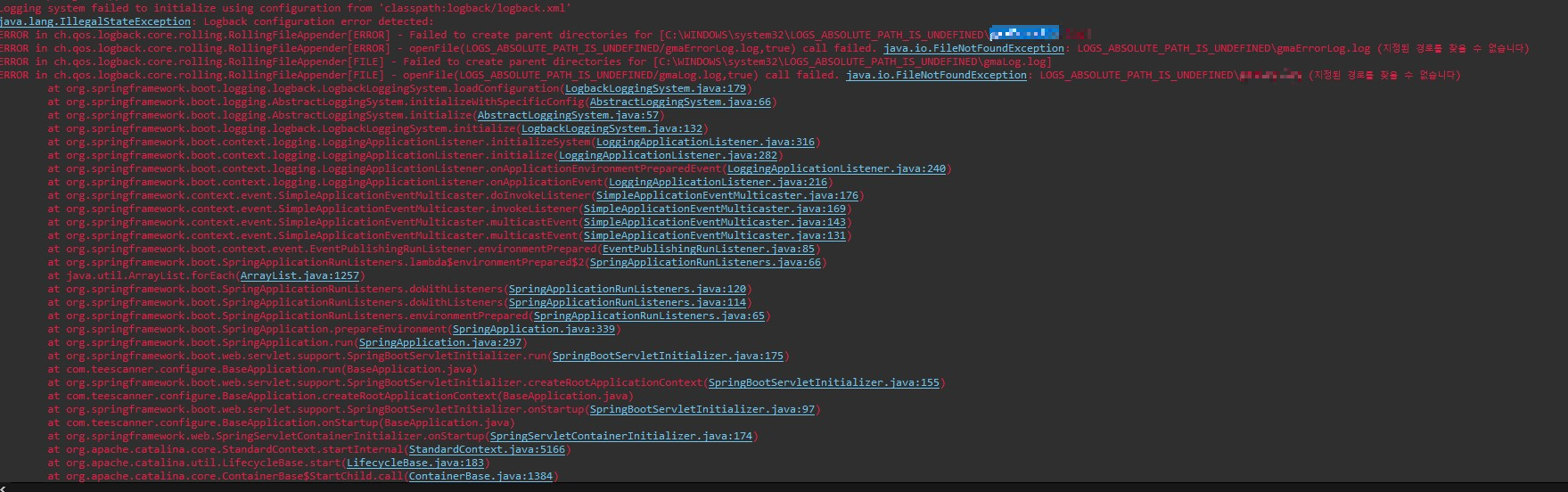 이런 식으로 환경이 로컬이냐 운영이냐에 따라 분리되어 경로 값을 지정해주고 있었다. 그런데 해당 파일에서 지정된 경로와 에러 메시지에서 나타난 경로가 서로 달랐다. 해당 logback.xml파일을 제대로 인식하고 있지 못하는 것 같았다.(정확히 C:\WINDOWS\system32\LOGS_ABSOLUTE_PATH_IS_UNDEFINED라고 적혀있다.)