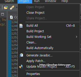 이클립스 상단 - Project 탭 클릭 - Clean... 부분 클릭