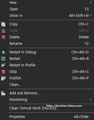 Servers 탭에서 해당 서버 우클릭 - 'Clean Tomcat Work Directory' 부분 클릭
