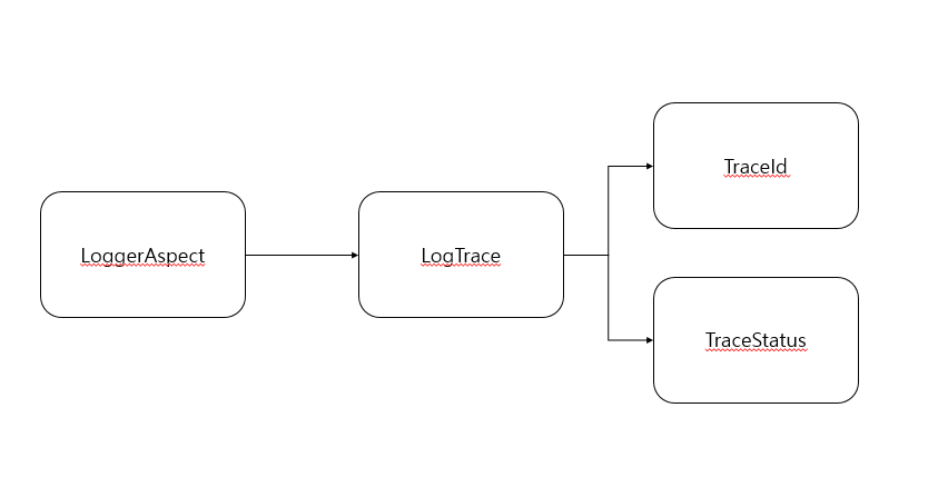 클래스 다이어그램은 다음과 같습니다. Aspect 부분인 LoggerAspect와 직접적인 구현부인 LogTrace가 있습니다. LogTrace의 begin(), end(), exception() 메서드를 사용하여 로그를 생성합니다. 그리고 스레드와 계층 별 레벨을 생성하기 위한 TraceId와 begin() 에서 생성하여 end()에 상태를 전달해주기 위한 TraceStatus 객체가 있습니다.