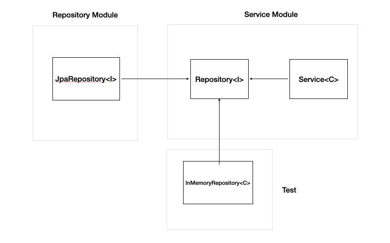 그림이 많이 바뀌었지만 사실 바뀐건 인터페이스 하나 더 만든거 밖에 없다. 먼저 기존 Repository 인터페이스를 JpaRepository로 이름을 변경하여 Jpa의 기능을 확장하는 인터페이스라는 명확한 이름을 지어주었다. 그리고 기존 서비스에 의존하는 인터페이스를 새로 만든다. 이렇게 의존관계를 역전시키면 더 이상 서비스 클래스가 JPA에 의존하지 않는다. 코드로 확인해보면